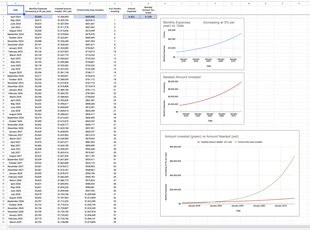 This template allows you to know exactly how much you will be spending in retirement + how much you will need to have invested to cover than much spending + the magic part: it shows you when you will be financially free and able to retire based on your current investing!!